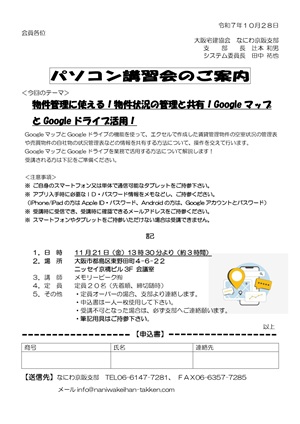 Google マップとGoogleドライブの機能を使って、エクセルで作成した賃貸管理物件の空室状況の管理表や売買物件の自社物の状況管理表などの情報を共有する方法について、操作を交えて行います。