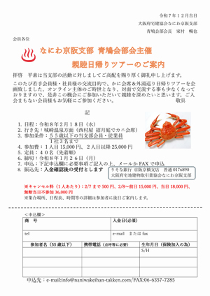 このたび若手会員様・社員様の交流目的で、かに会席&外湯巡り日帰りツアーを企画致しました。オンライン主体のご時世となり、対面で交流する事も少なくなっておりますので、是非この機会にご参加いただいて親睦を深めたいと思います。